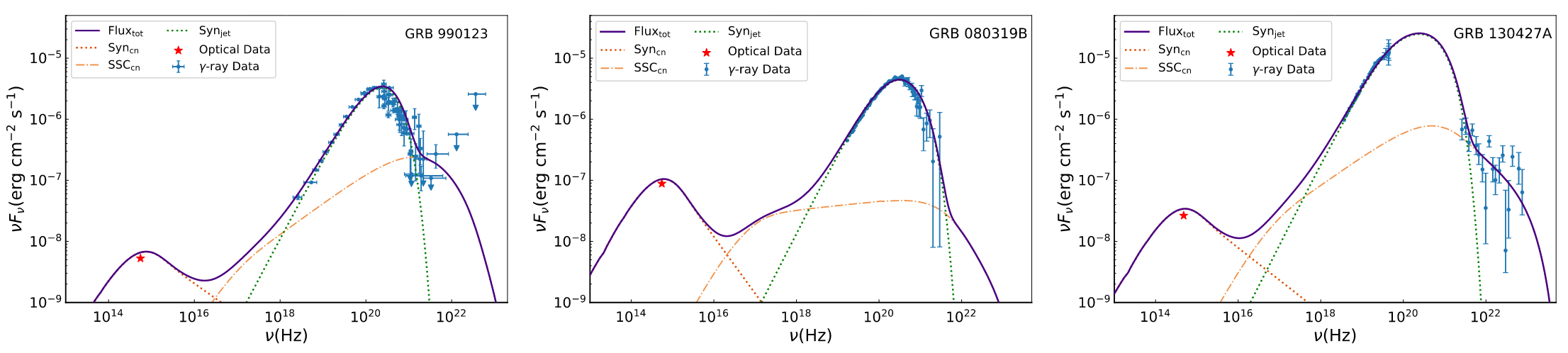 1:伽马射线暴990123080319B130427A在光学、X射线和伽马射线波段的瞬时发射光谱。